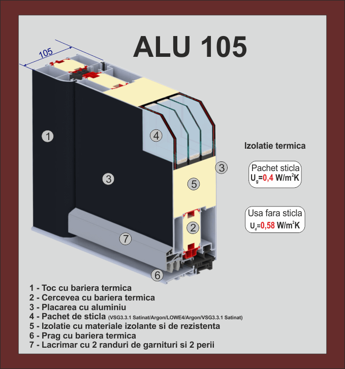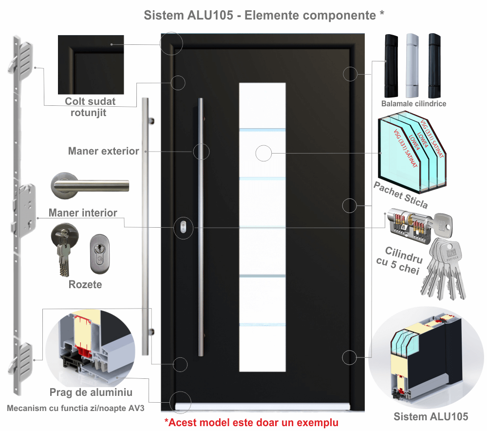 ALU105 este sistemul nostru Premium de usi din aluminiu complet, realizat dintr-un profil din aluminiu special, foarte rezistent, cu o adancime totala de 105 mm.