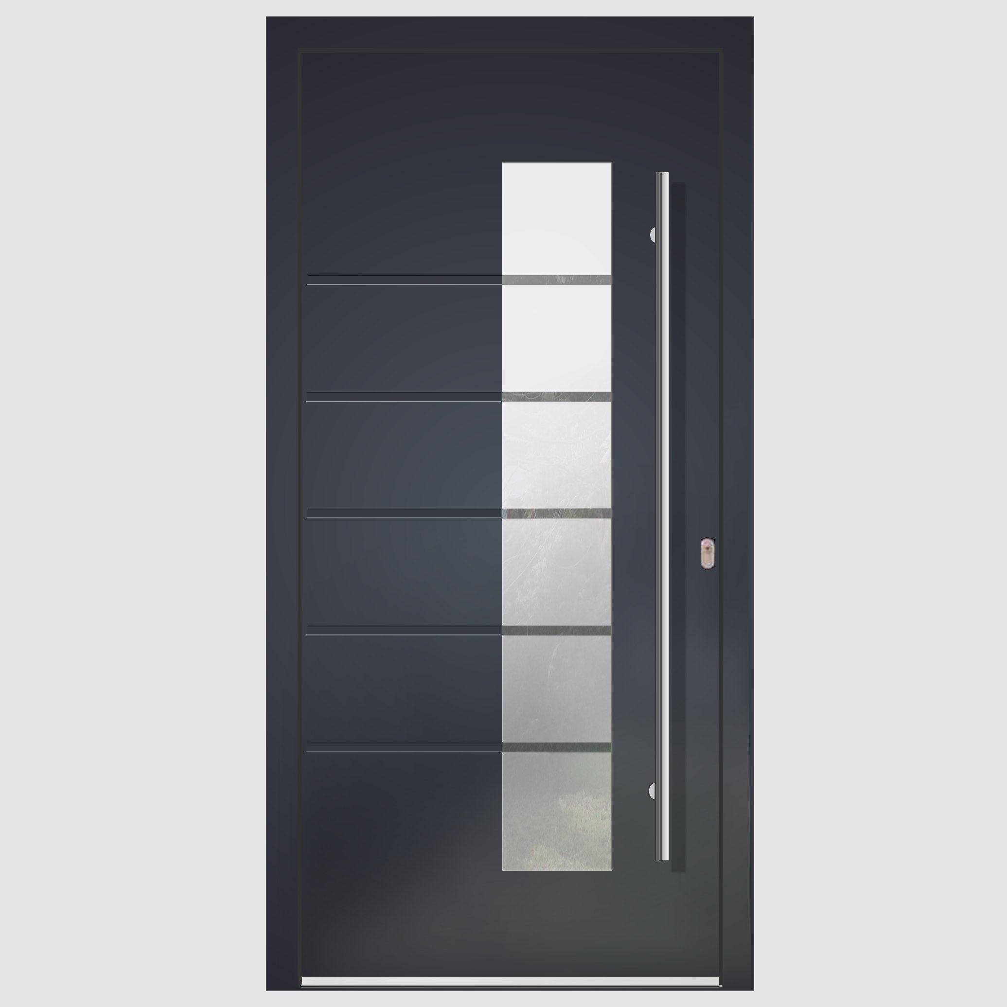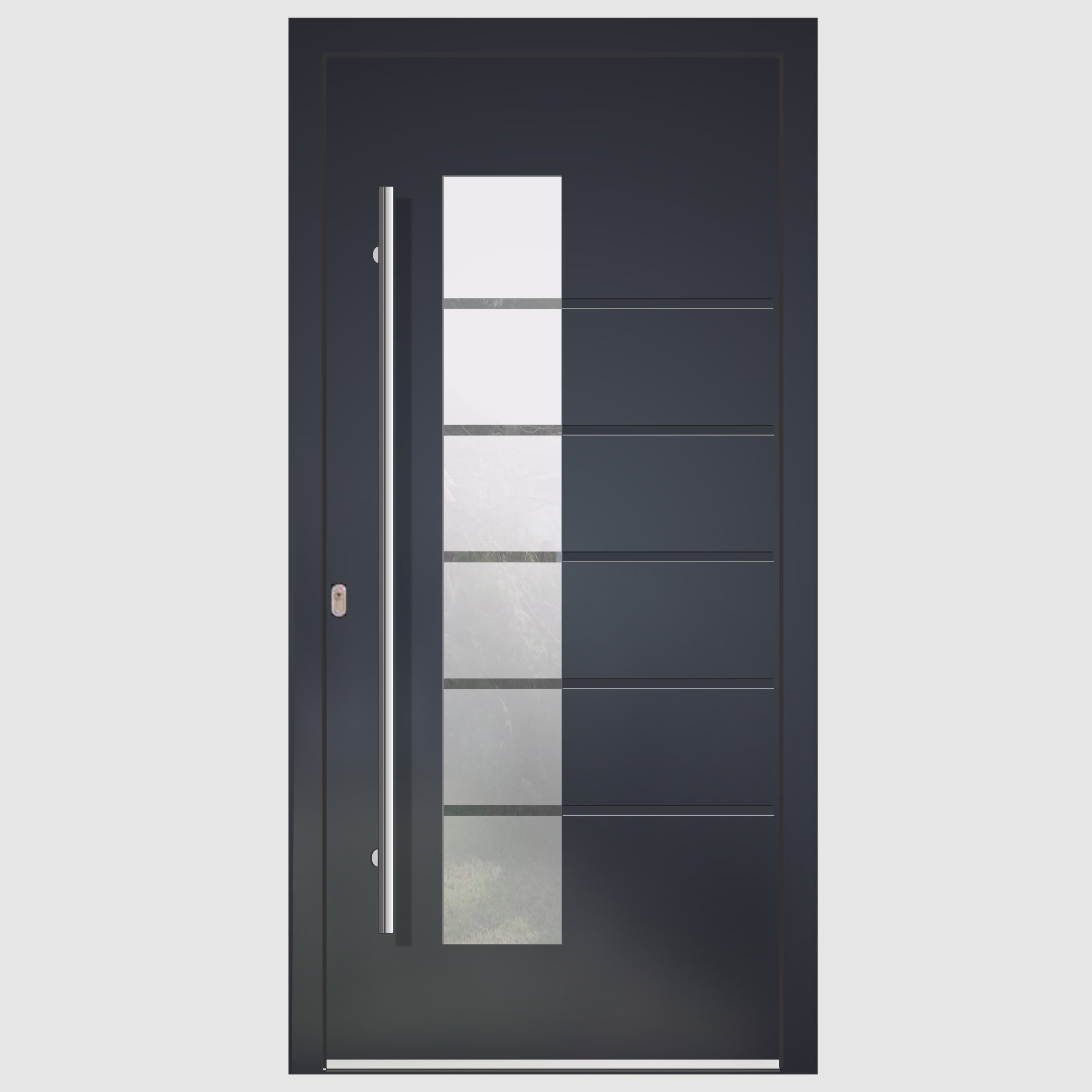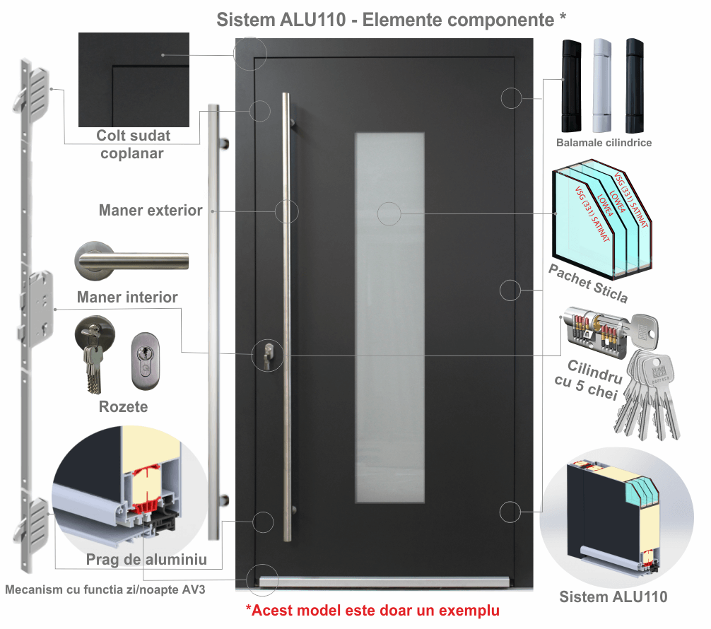 Toate elementele sunt incluse: Toc, foaie de usa cu cercevea complet din aluminiu, in exterior maner tip bara, la interior maner M45, sistem de inchidere mecanic - automat de la Winkhaus AV3 si comutator zi/noapte, cilindru cu 5 chei cu functie de urgenta de la Winkhaus, prag cu bariera termica, sticla cu dungi transparente, usa la exterior este cu dungi frezate, 3 balamale cilindrice reglabile 3D.