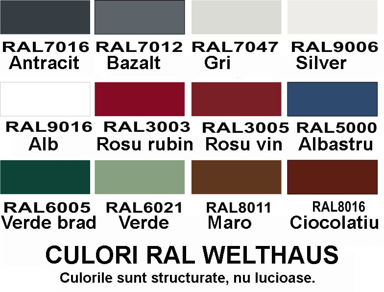 - diferite culori si combinatii posibile, vopsit cu pulbere in camp electrostatic, cu aspect structurat (mat)!