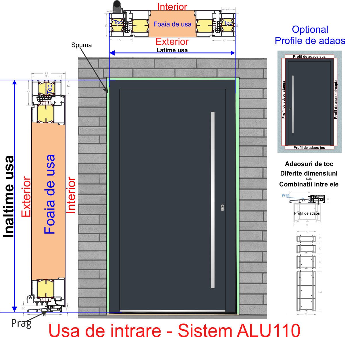 Sistem complet de usa cu profil din aluminiu + foaia de usa din aluminiu, full aluminiu interior si exterior
