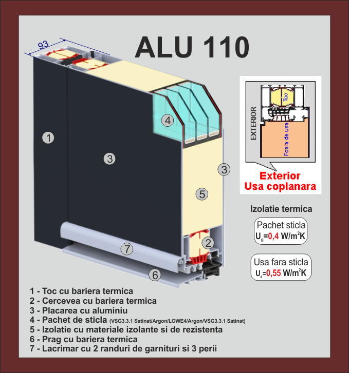 ALU110 este sistemul nostru COPLANAR de usi din aluminiu complet, realizat dintr-un profil din aluminiu special, foarte rezistent, cu o adancime totala de 93 mm.