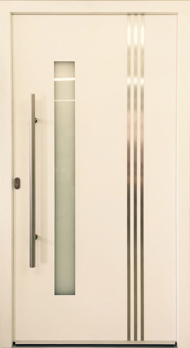 Toate elementele sunt incluse: Toc, foaie de usa cu cercevea placata interior si exterior, in exterior maner tip bara, sistem de inchidere mecanic-automat de la Winkaus AV3 si comutator zi/noapte, cilindru cu 5 chei si functie de urgenta de la Winkhaus, prag cu bariera termica, decoratiunile din inox, 3 balamale reglabile 3D.