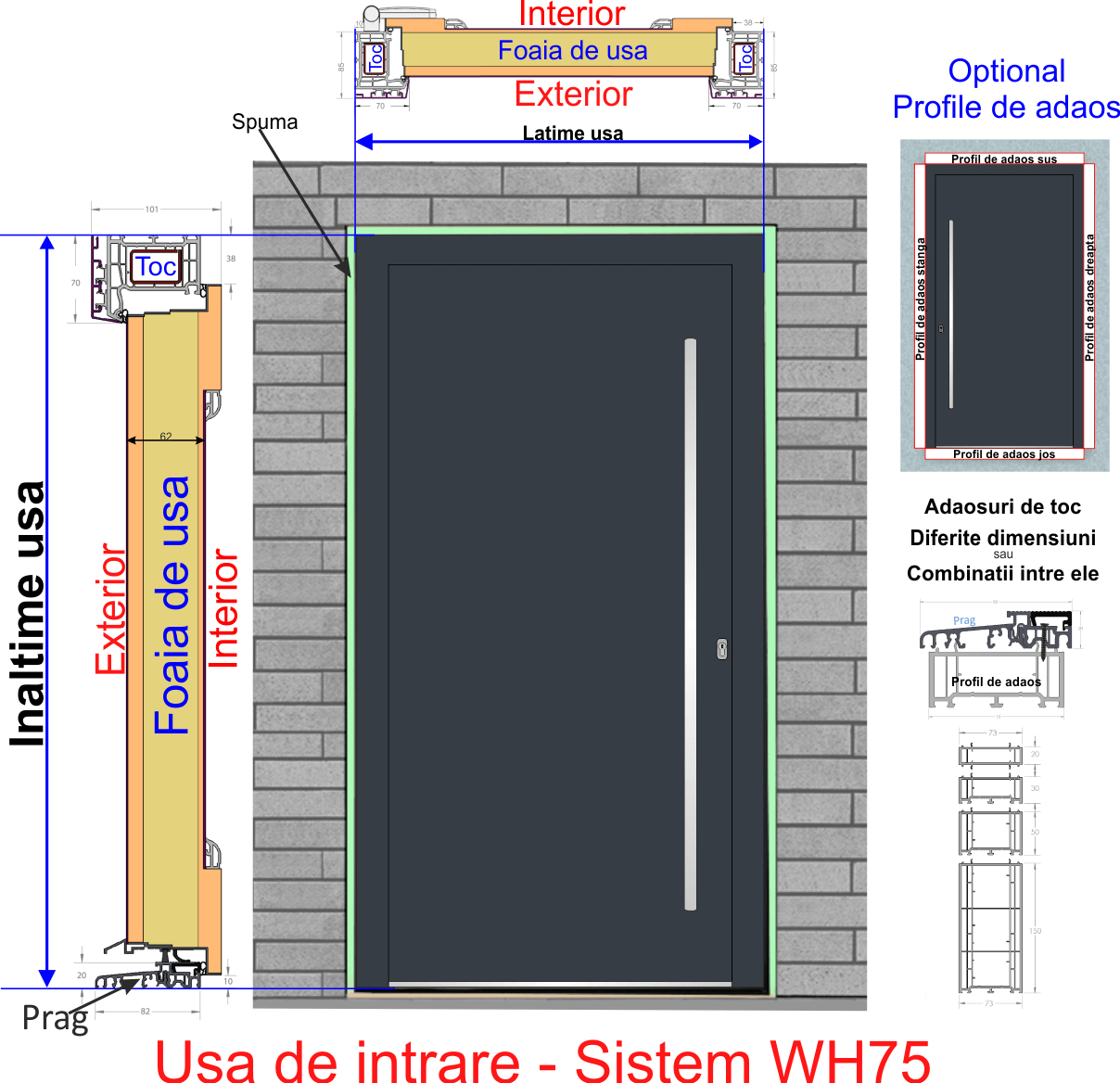 Usa de intrare WH75 din pvc placat cu aluminiu.