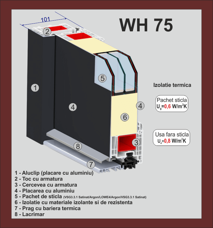 WH75 este sistemul nostru Standard, realizat dintr-o combinatie de PVC placat cu aluminiu, avand o adancime totala de 102 mm.