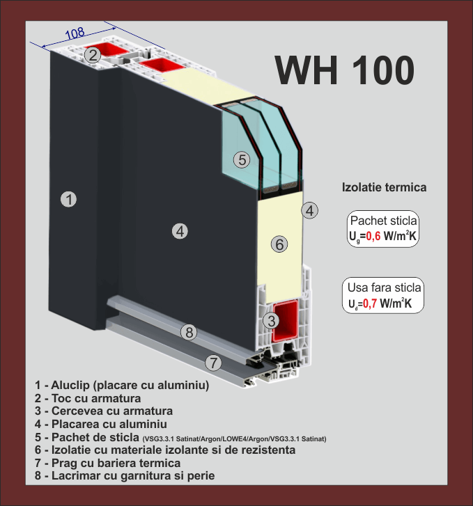 WH100 este sistemul nostru Premium, realizat dintr-o combinatie de PVC placat cu aluminiu, avand o adancime totala de 110 mm.